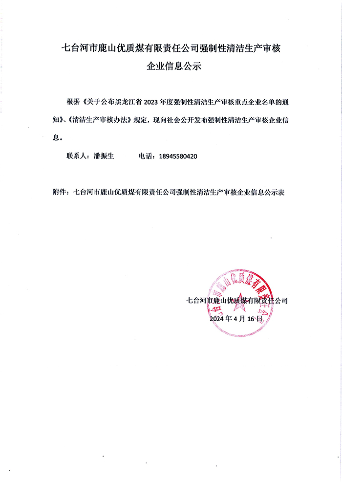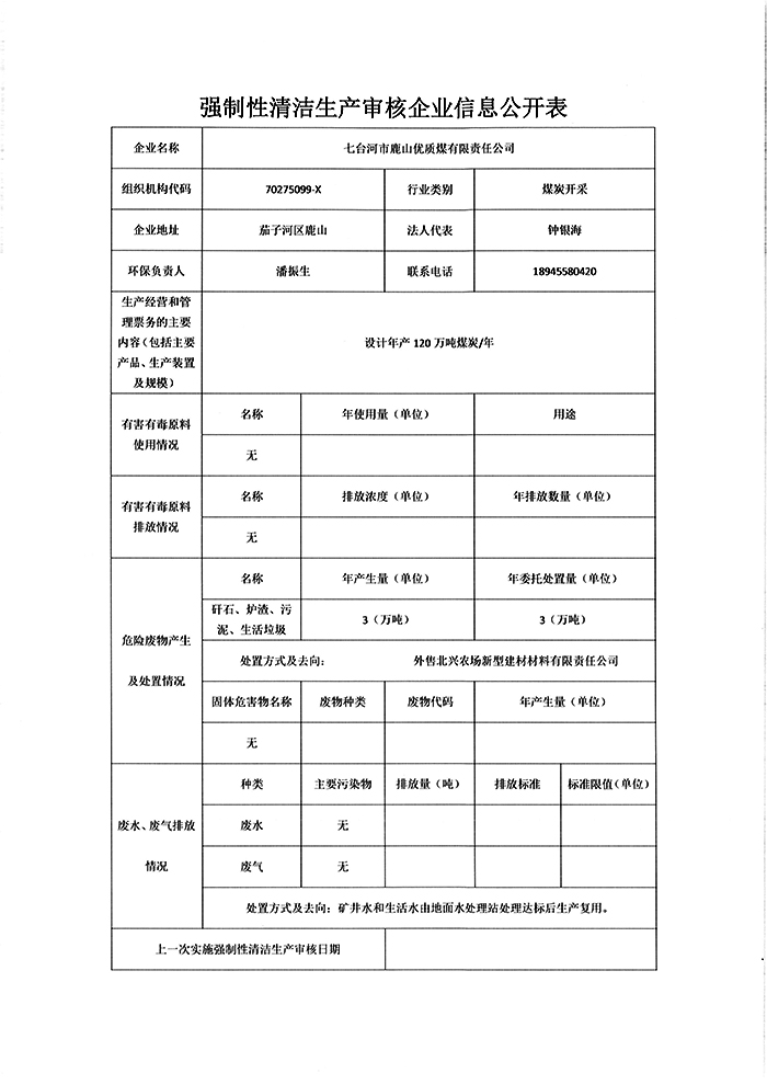 七臺河市鹿山優(yōu)質(zhì)煤有限責(zé)任公司強制性清潔生產(chǎn)審核企業(yè)信息公示